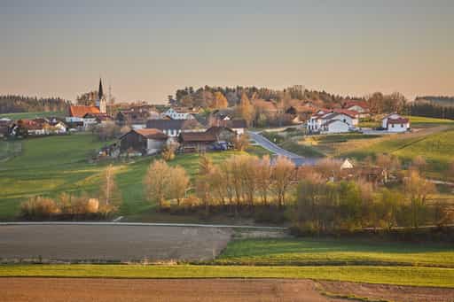 Arbing in der Gemeinde Reischach, Landkreis Altötting, Oberbayern. Es zeigt eine ländliche Landscha…