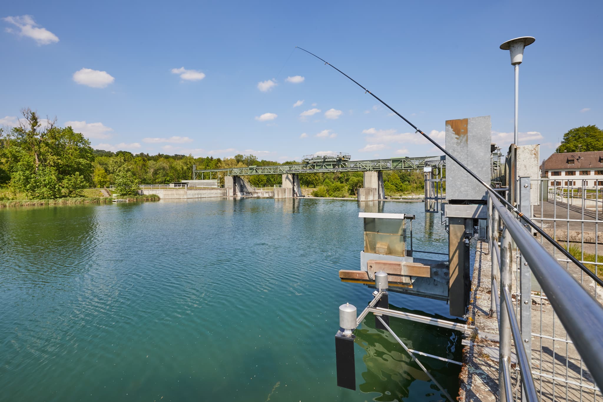 Alz bei Burgkirchen-Hirten, Burgkirchen, Landkreis Altötting, Oberbayern, Inn-Salzach, Deutschland. Flusslandschaft mit Wehranlage, Ufern, Radweg.