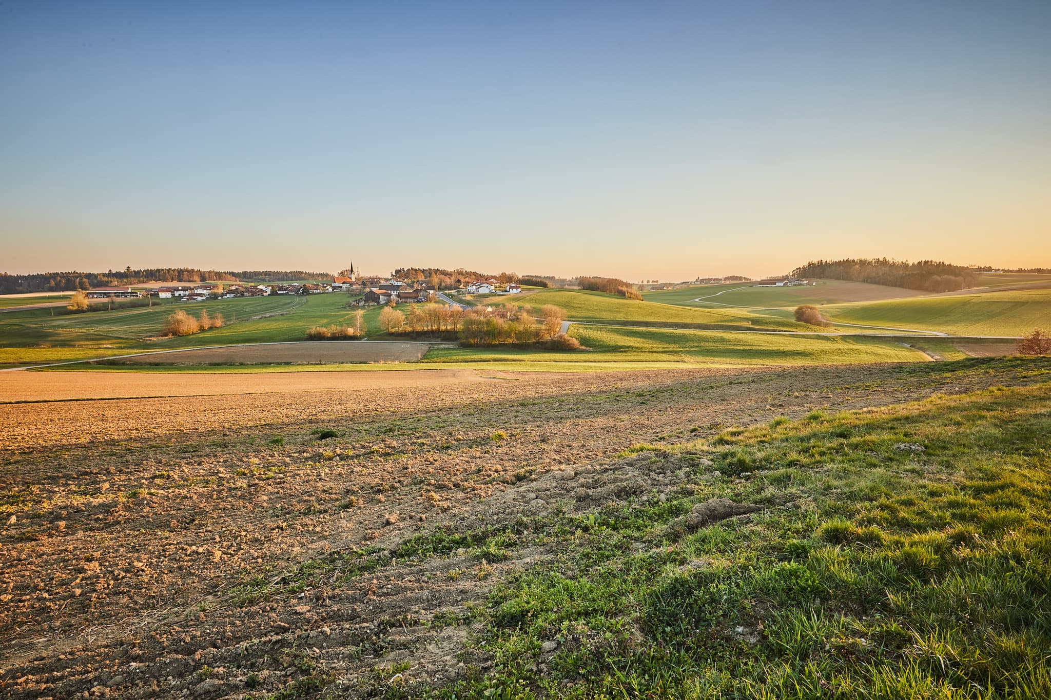 Landschaftsbild Arbing und Ecking, Reischach, Landkreis Altötting, Oberbayern. Sanfte Hügel und Felder der Region Inn-Salzach, Deutschland, im Abendlicht.