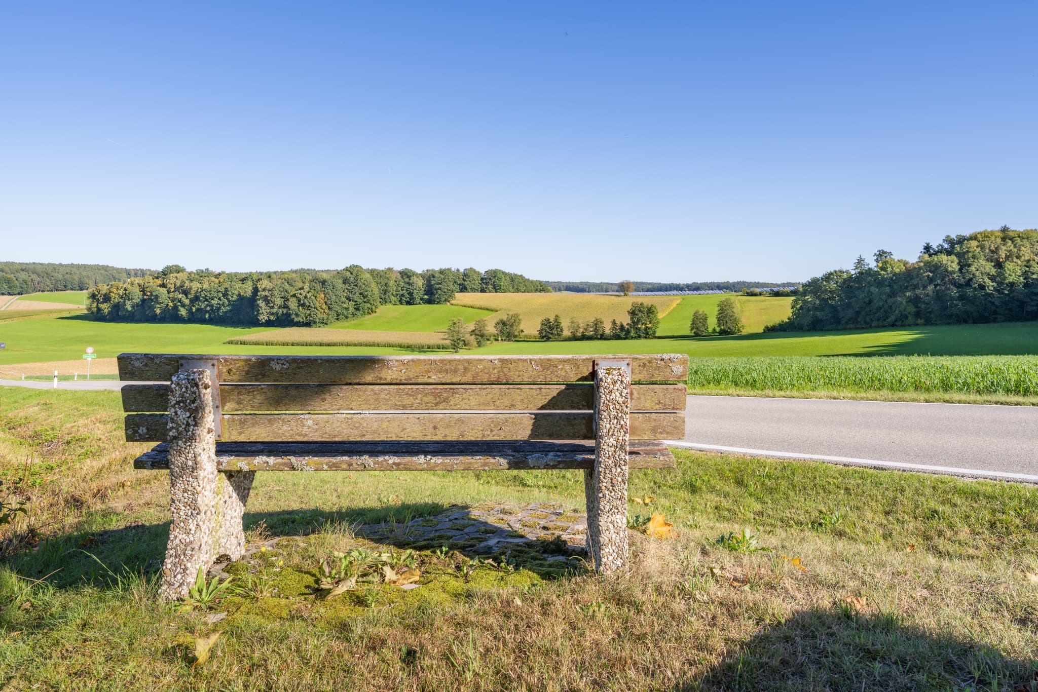 Sitzbank am Feldrand bei Baumgarten, Dietersburg im Landkreis Rottal-Inn, Niederbayern. Die Landschaft im Holzland, Deutschland, zeigt Maisfelder, Wälder.