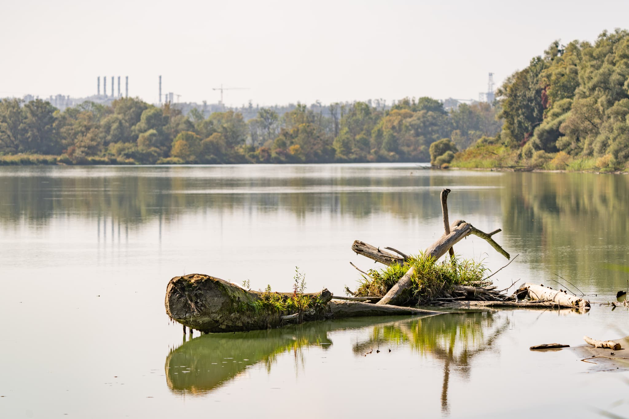 Ruhiger See mit Treibholz bei Innspitz, Haiming. Umgeben von Bäumen, Industrie im Hintergrund. Landkreis Altötting, Oberbayern, Inn-Salzach, Deutschland.