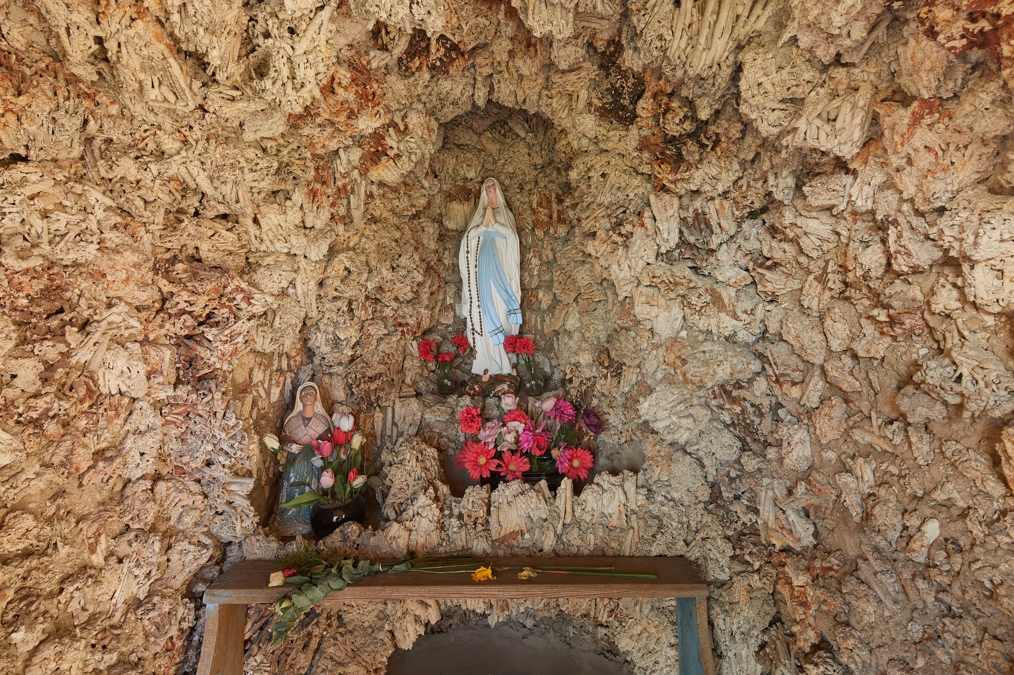 Bildstock in Niederaich, Pleiskirchen, Altötting, Regierungsbezirk Oberbayern, Holzland, Bayern, Deutschland. Marienstatue in einer felsigen Nische.