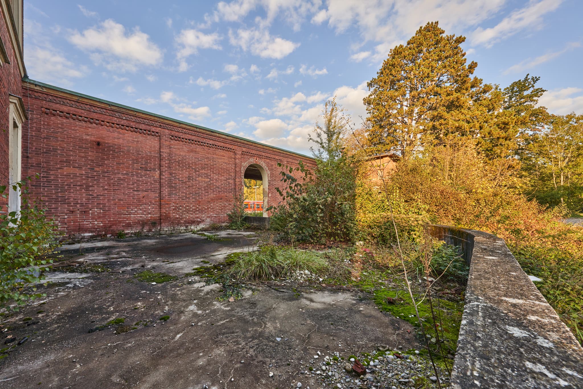 Eisenfelden Bahnhof Neuötting, Winhöring, Altötting, Oberbayern. Eine Backsteinmauer und zugewachsene Plattform am Bahnhof, Inn-Salzach Region.