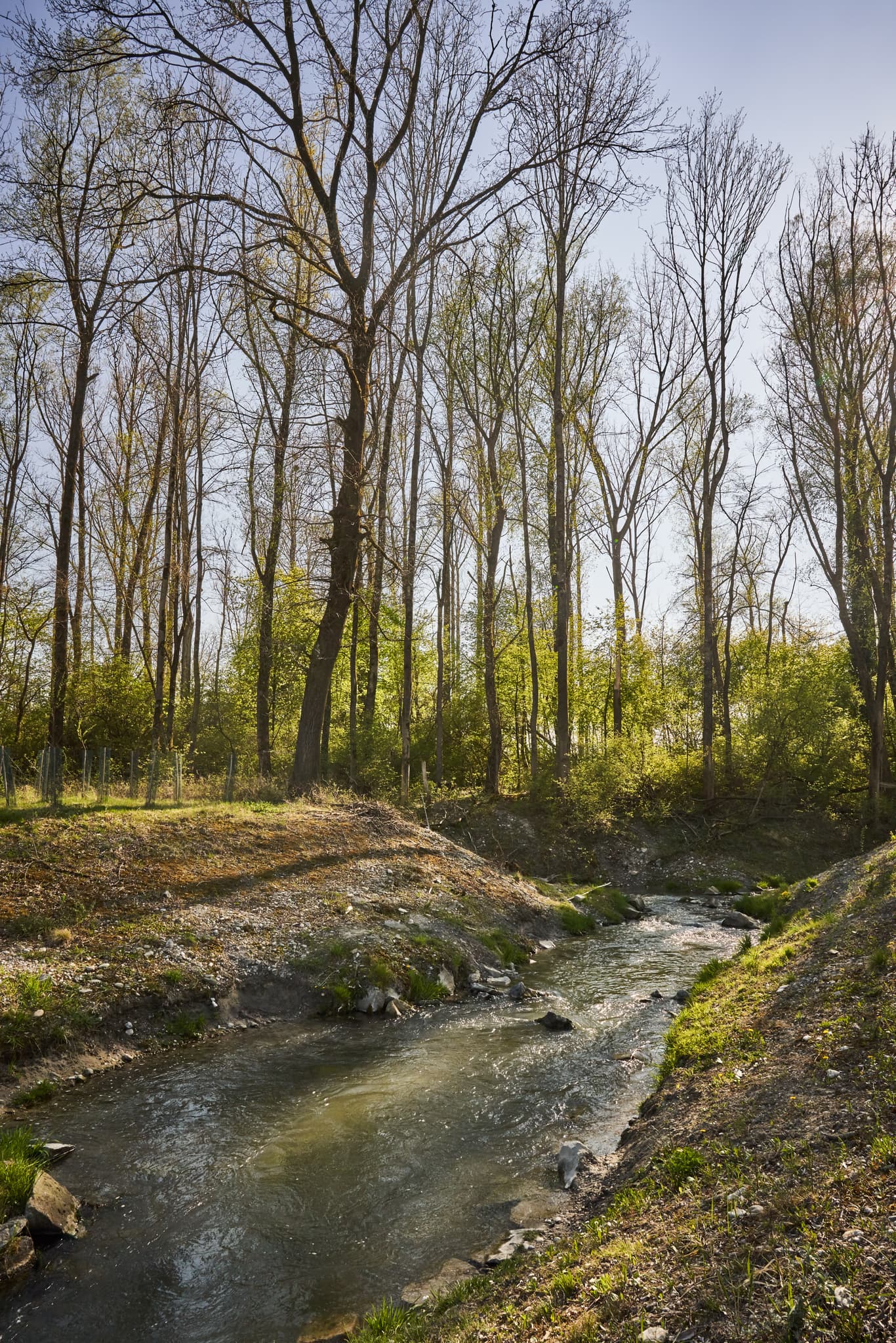 Fischtreppe am Inn Kraftwerk in Stammham, Altötting, Oberbayern. Ein Bach fließt durch Wald der Region Inn-Salzach, Deutschland.
