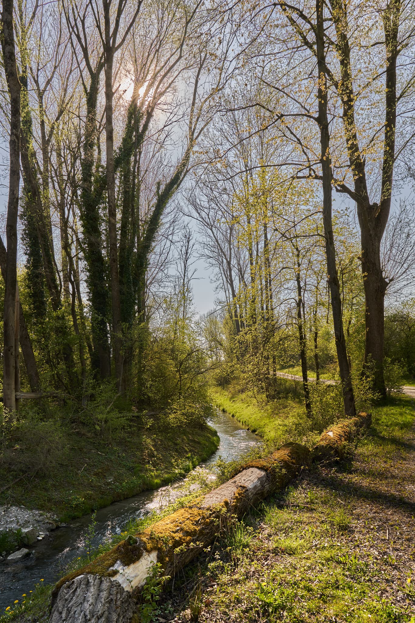 Fischtreppe am Kraftwerk in Stammham, Landkreis Altötting, Oberbayern. Bachlauf mit Baumstamm und Bäumen. Idyllische Natur im Inn-Salzach Gebiet, Deutschland.