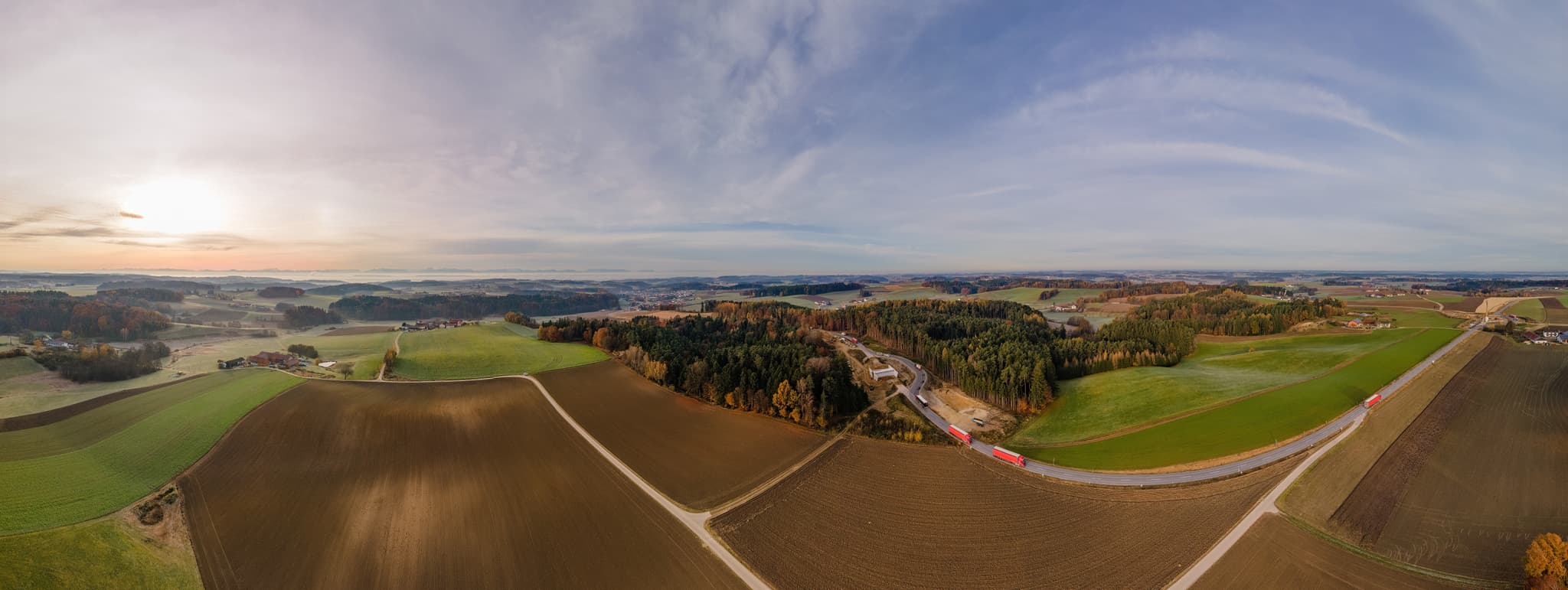 Luftaufnahme der Baustelle Fuchsberg in Reischach, Altötting, Oberbayern. Zeigt Felder, Wald und eine Straßeim Ausbau im Inn-Salzach / Holzland Gebiet.