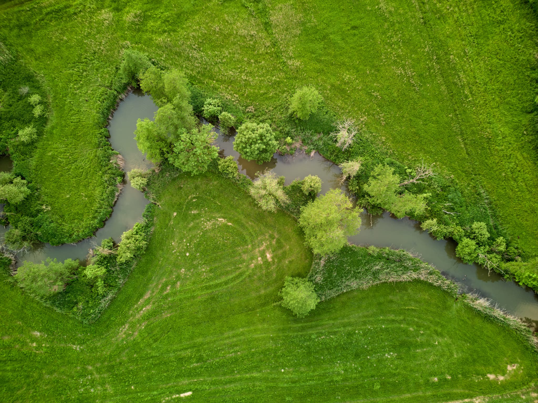Geratskirchner Bachs, der sich durch Wiesen und Felder bei Hirschhorn, Wurmannsquick, schlängelt. Landkreis Rottal-Inn, Holzland, Niederbayern, Deutschland.