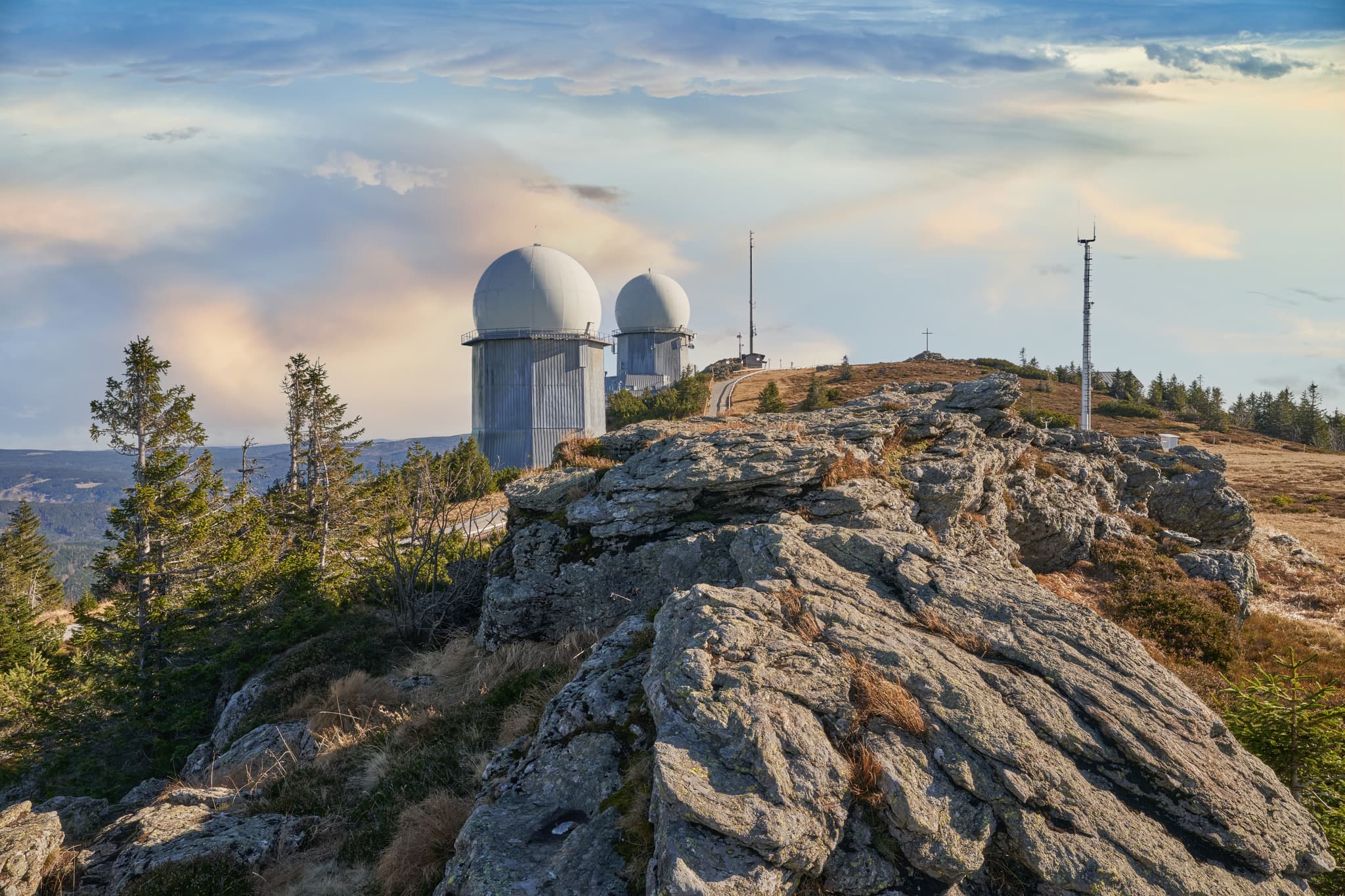 Panoramablick Großer Arber Radom mit Felsen, Bäumen, Fernsicht. Anlage in Bayerisch Eisenstein, Landkreis Regen, Oberpfalz, Deutschland, Oberpfälzer Jura.