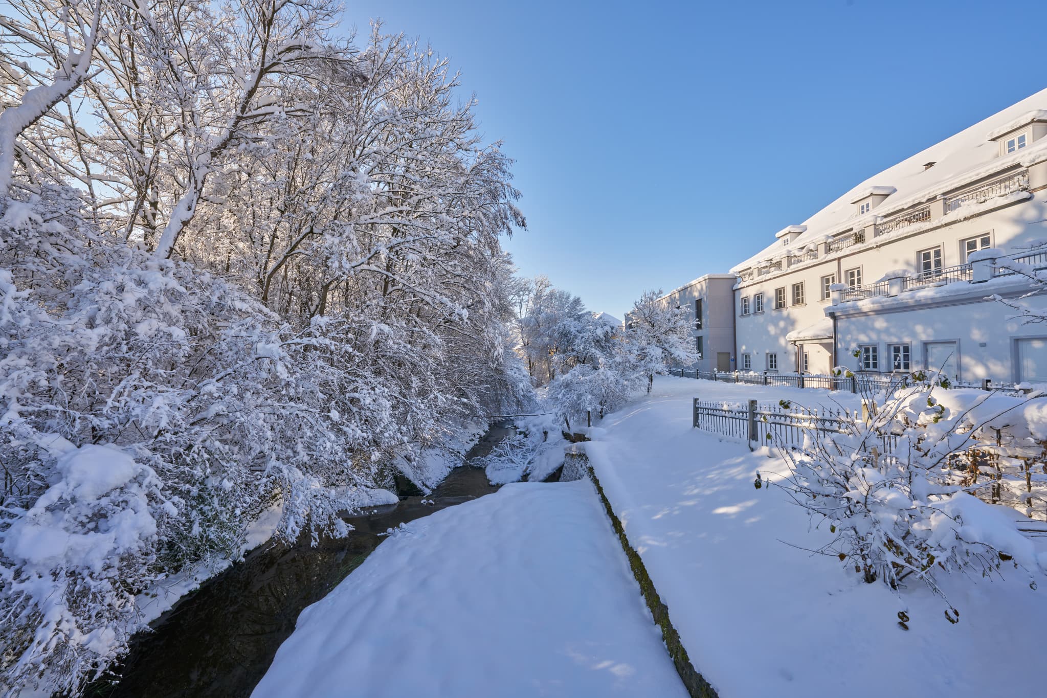 Verschneite Winterlandschaft mit Bachlauf in Reischachbach, Landkreis Altötting, Oberbayern. Ruhige Szenerie in der Region Inn-Salzach, Deutschland.