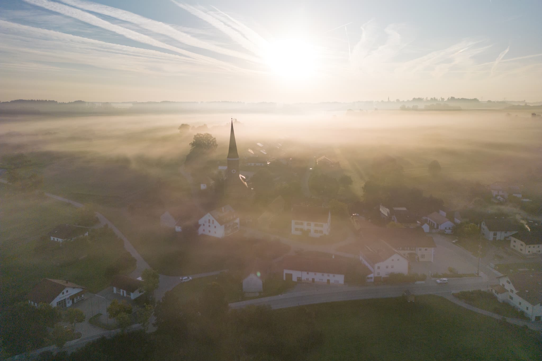 Luftbild von Hirschhorn in Wurmannsquick, Landkreis Rottal-Inn, Niederbayern, Deutschland. Dorf und Kirche im Morgennebel. Sonnenaufgang im Herbst im Holzland.