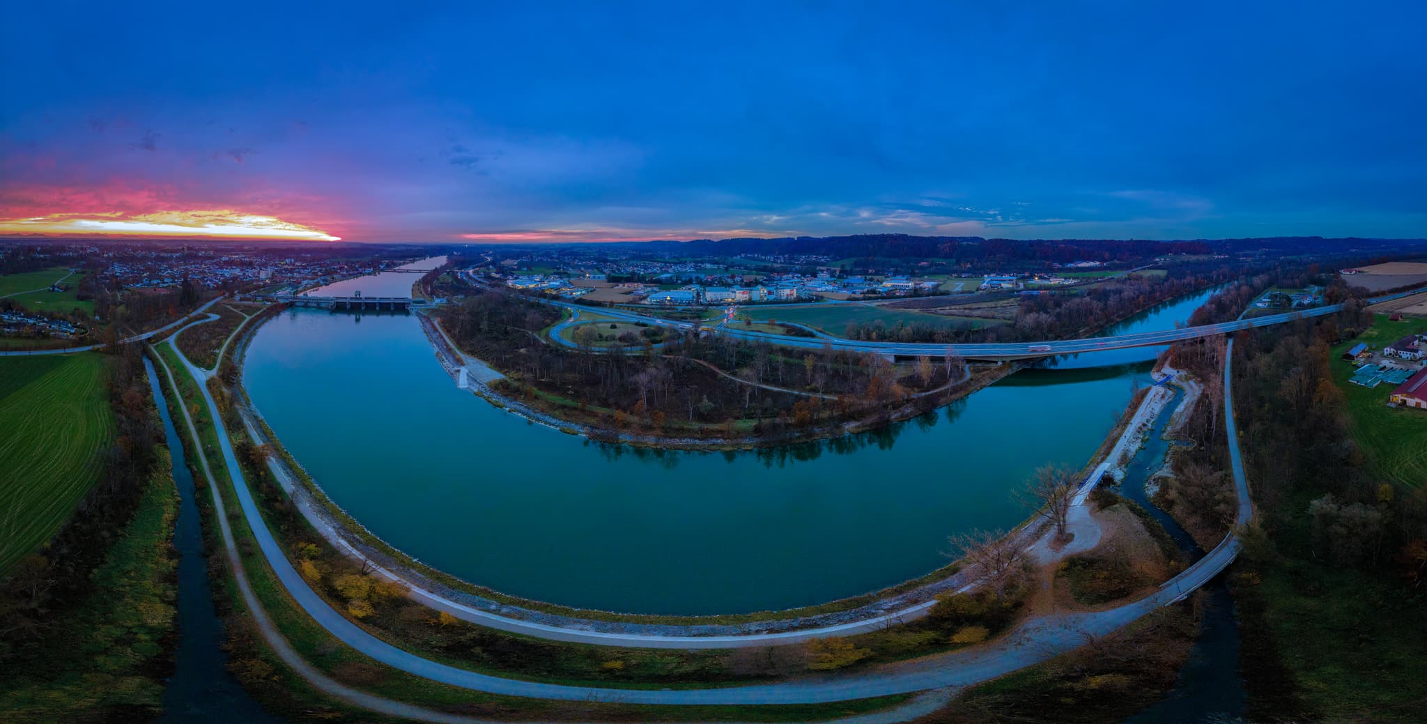 Sonnenuntergang über Neuötting, Landkreis Altötting, Oberbayern. Panorama des Inns mit Wehr und Stadtansicht bei Dämmerung.