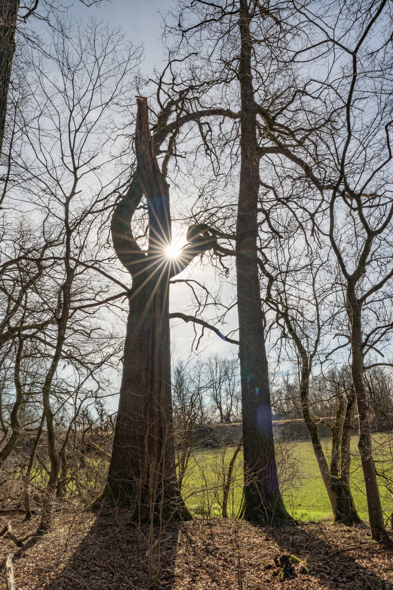 Landschaftsbild vom Isen-Stausee in Winhöring, Landkreis Altötting, Oberbayern, Deutschland. Markante Bäume mit Sonnenschein in der Inn-Salzach Region.