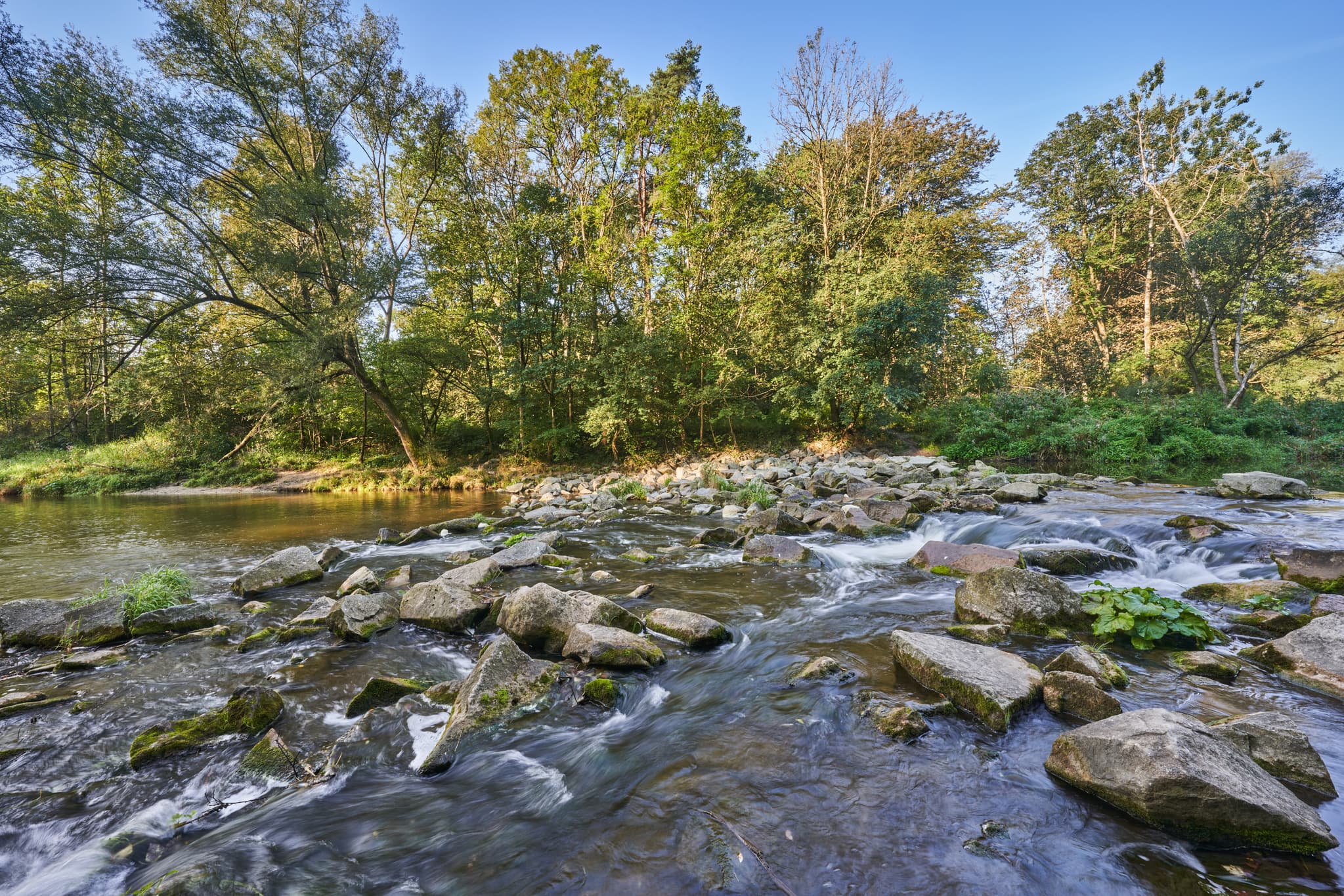 Isen Stromschnelle in Steinhöring, Gemeinde Winhöring, Landkreis Altötting, Oberbayern, Deutschland. Flusslandschaft, Inn-Salzach, Felsen, Wasser, Bäume.
