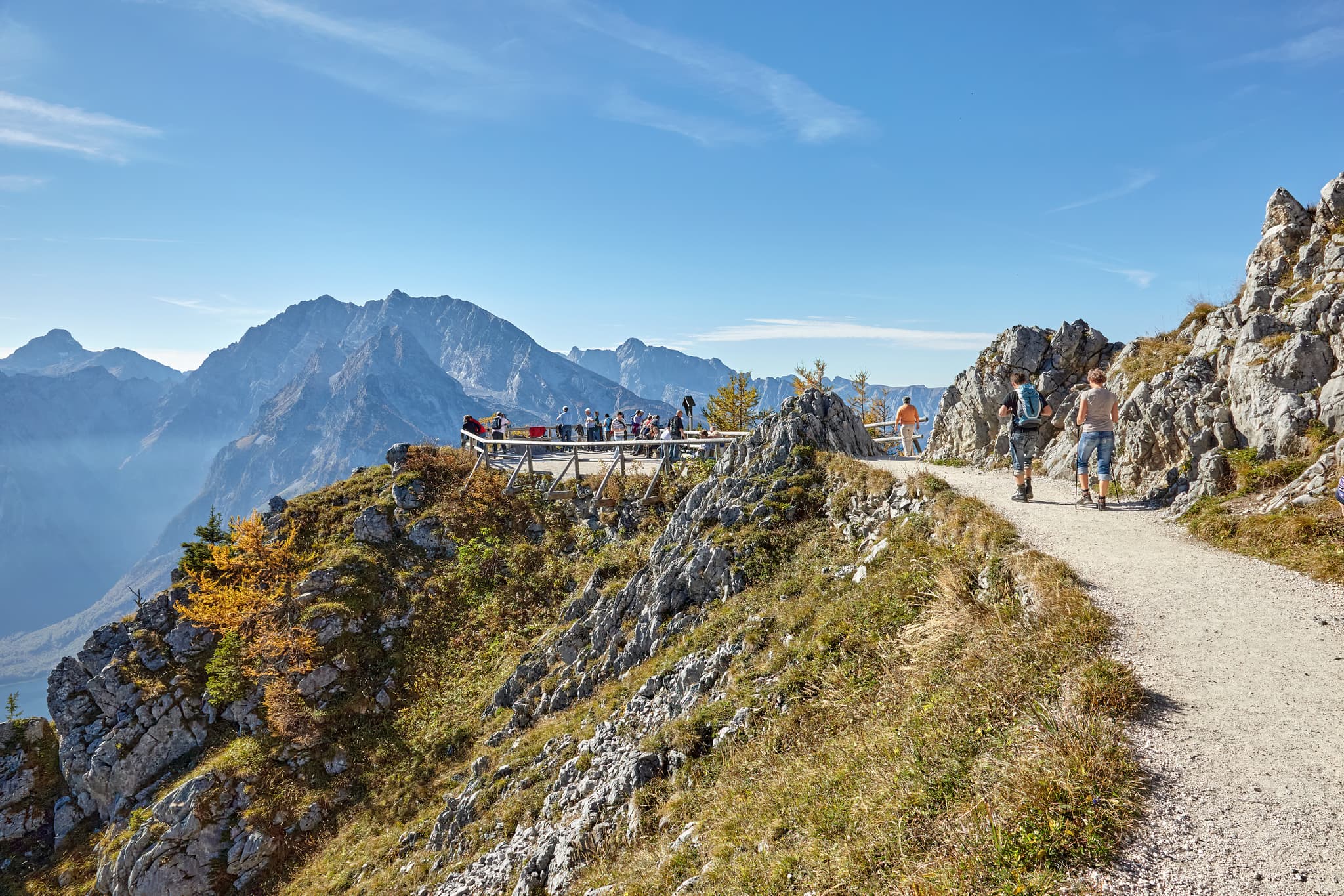 enner Plattform in Schönau, Berchtesgadener Land, Oberbayern, Deutschland. Alpine Landschaft der Berchtesgadener Alpen mit Wanderern, klarem Himmel.