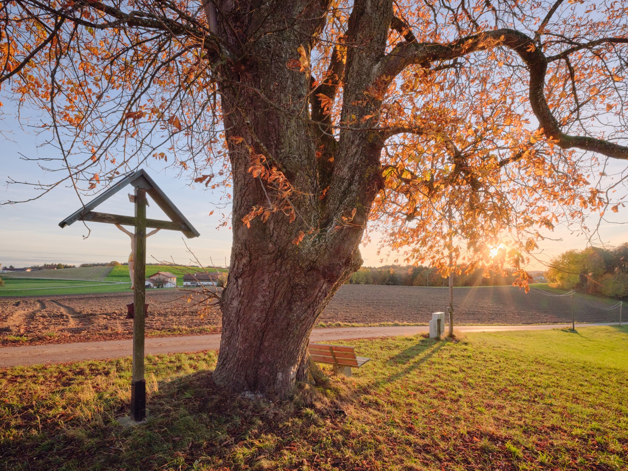 Alte Kastanie mit Wegkreuz und Sitzbank in Petzlberg, Reischach, Altötting, Oberbayern. Inn-Salzach, Deutschland.