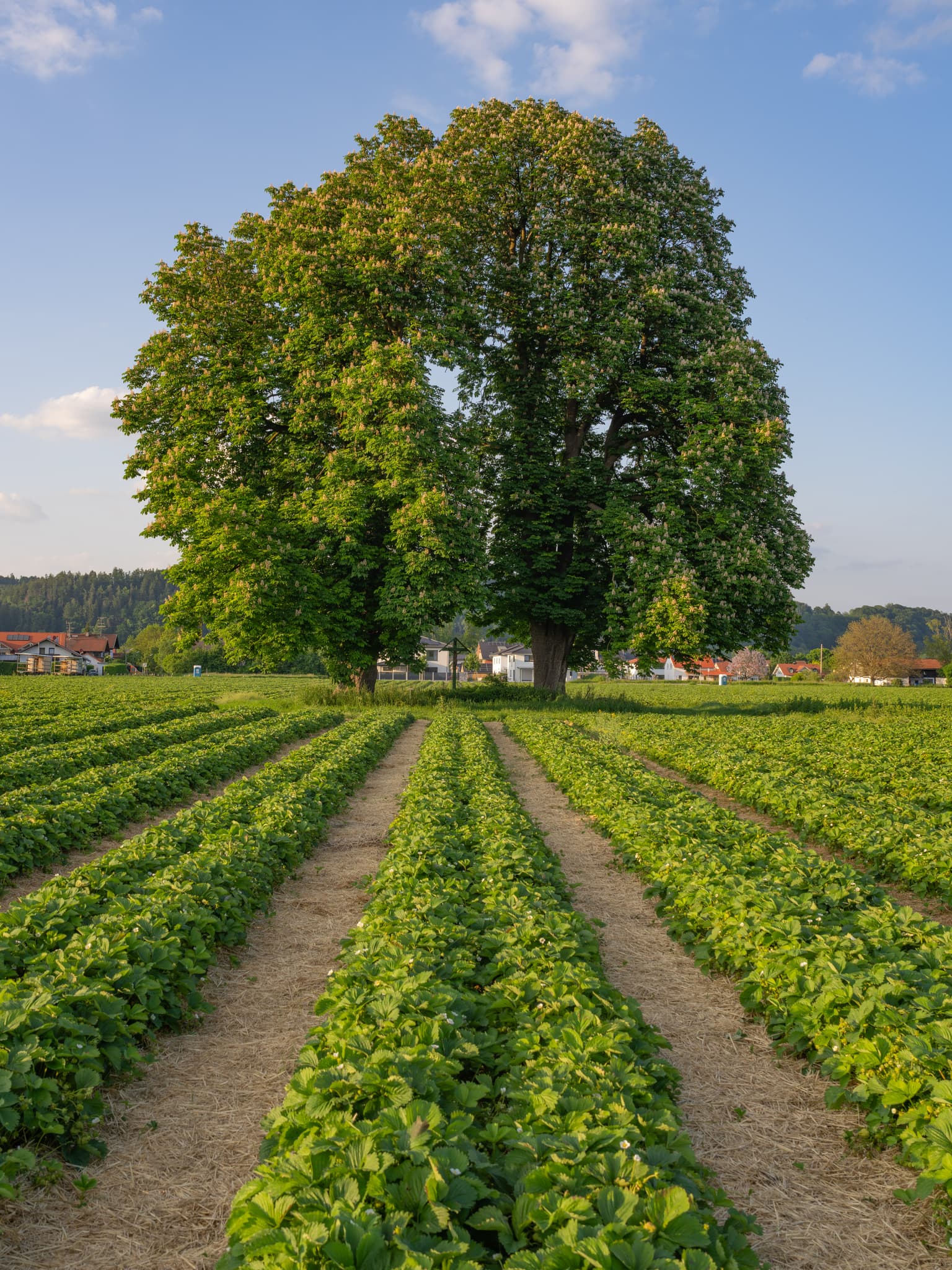 Im Bild ist ein weites Erdbeerfeld mit großen Kastanienbäumen in Unterau, Gemeinde Winhöring, Landkreis Altötting, Oberbayern, Inn-Salzach, Deutschland.
