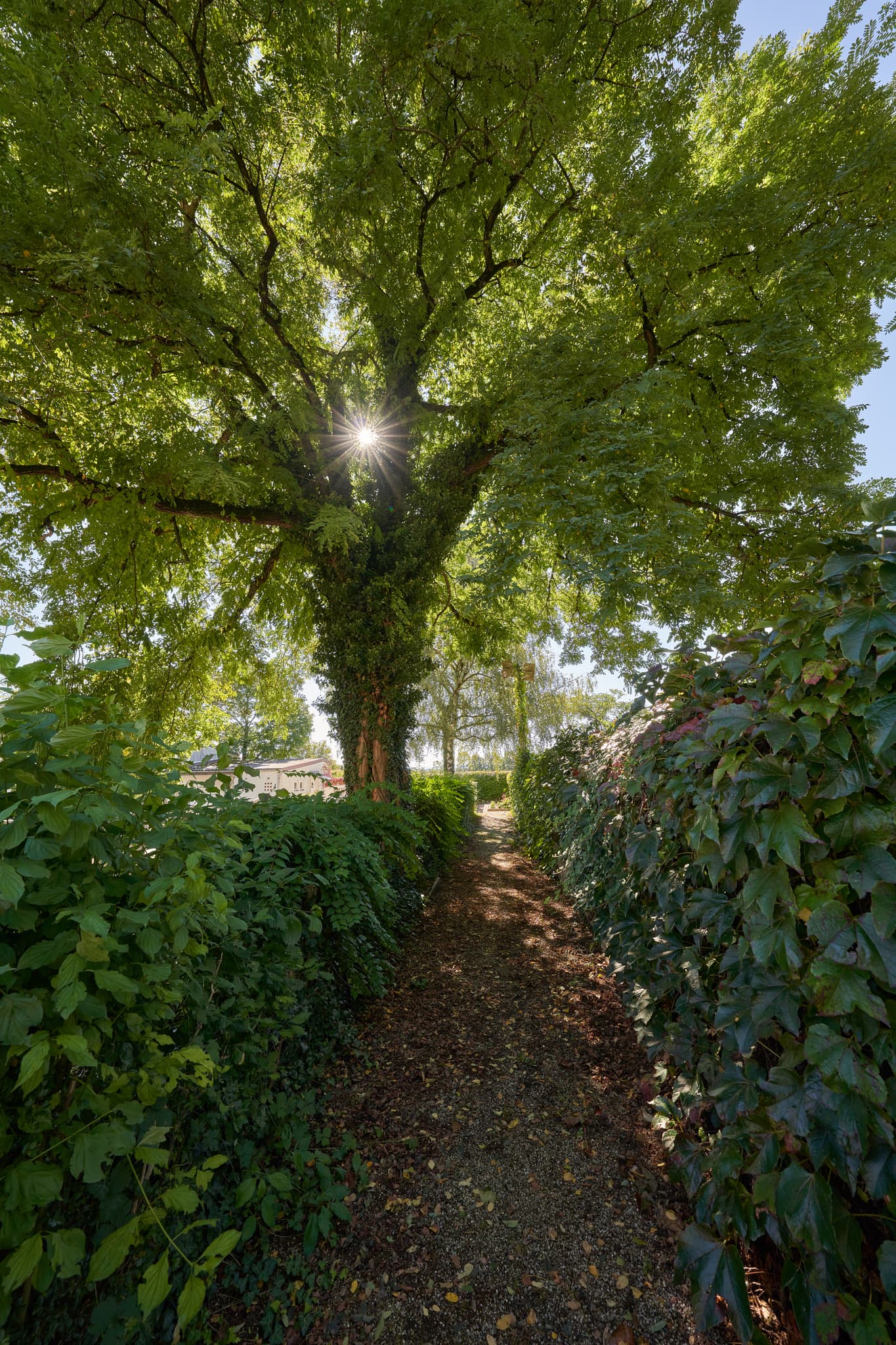 Weg durch Friedhof der Kirche St. Maria in Winhöring, Landkreis Altötting, Oberbayern, Deutschland. Alter Baum mit Sonnenstern in der Inn-Salzach-Region.