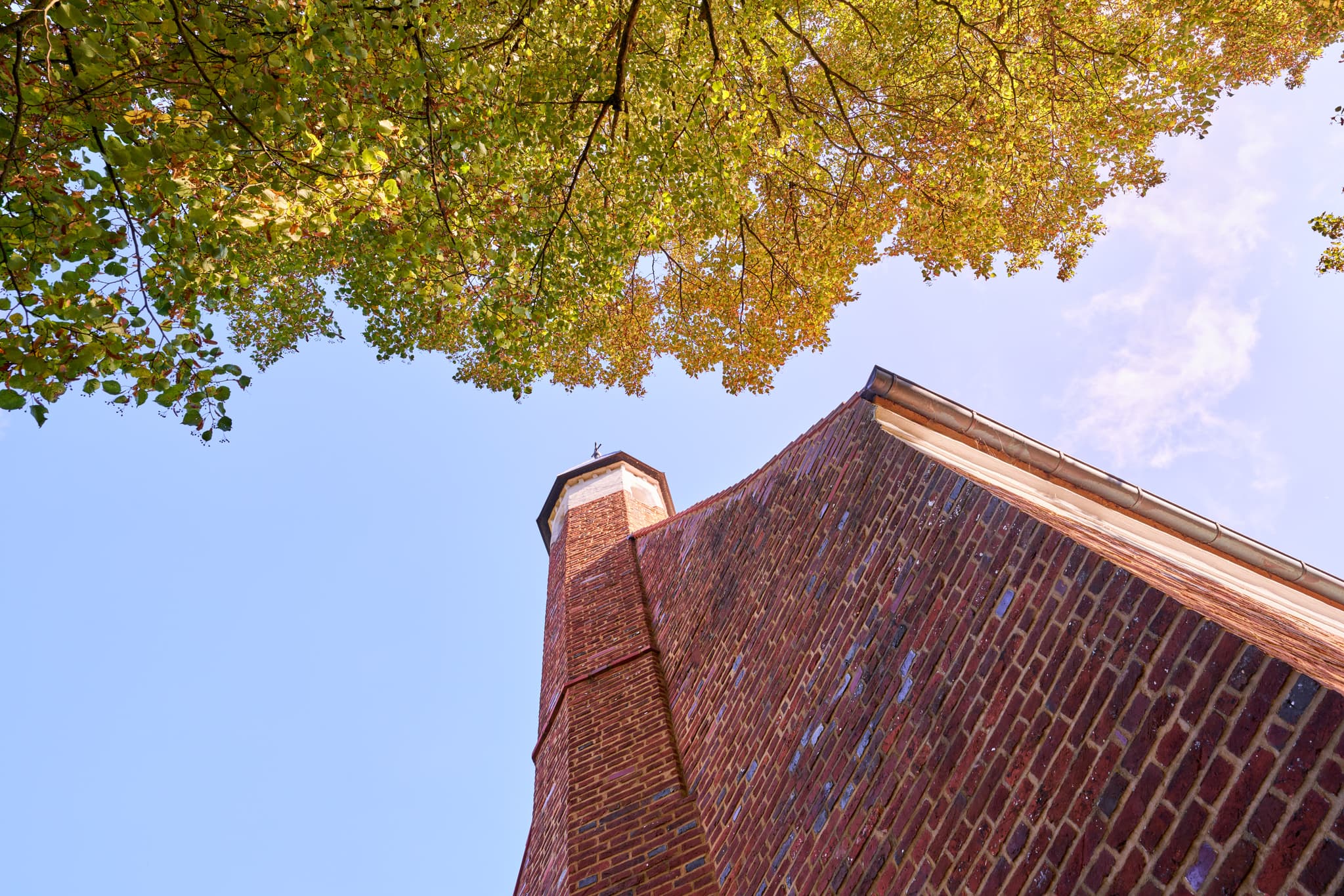 Kirchlein Martinskirchen St. Koloman, Wurmannsquick. Rottal-Inn, Niederbayern, Holzland, Deutschland. Ziegelbauwerk unter Baumkronen am Himmel.