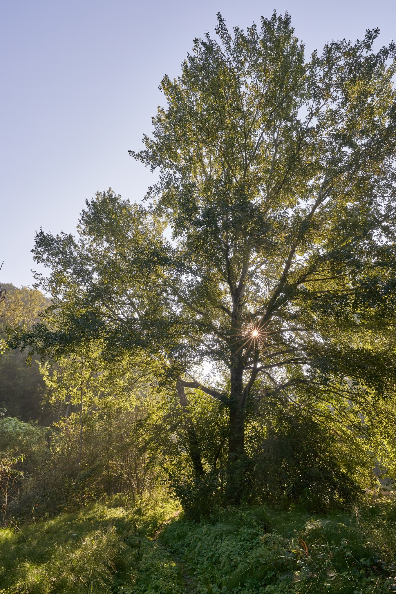 Pilgerweg in der Landschaft bei Steinhöring Isen, Gemeinde Winhöring, Landkreis Altötting, Oberbayern, Inn-Salzach, Deutschland. Zeigt Baum mit Sonnenstrahlen.