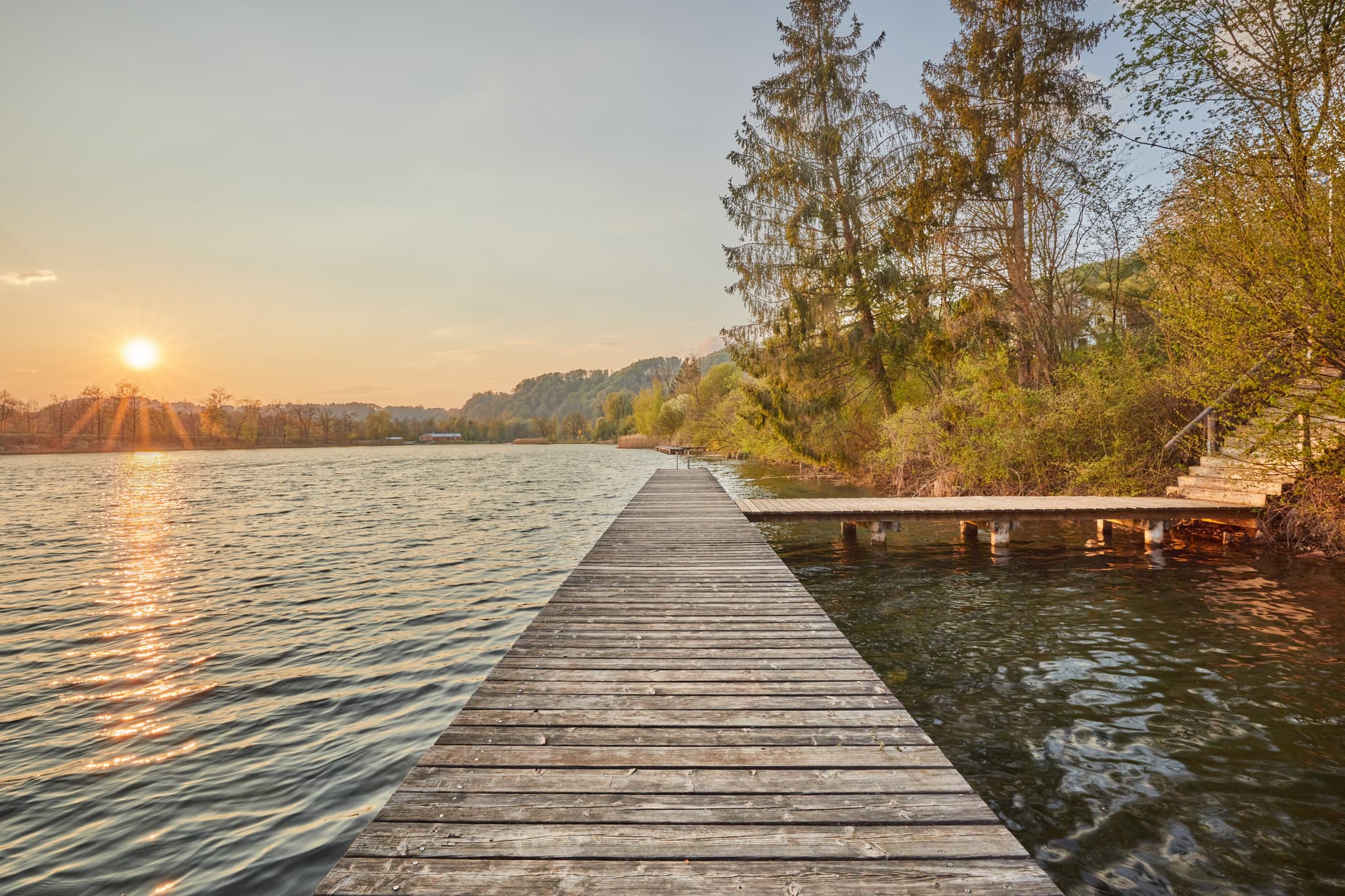 Sonnenuntergang am Marktler Badesee in Oberbayern, Inn-Salzach, Deutschland. Langer Steg am Seeufer. Idyllische Naturlandschaft.
