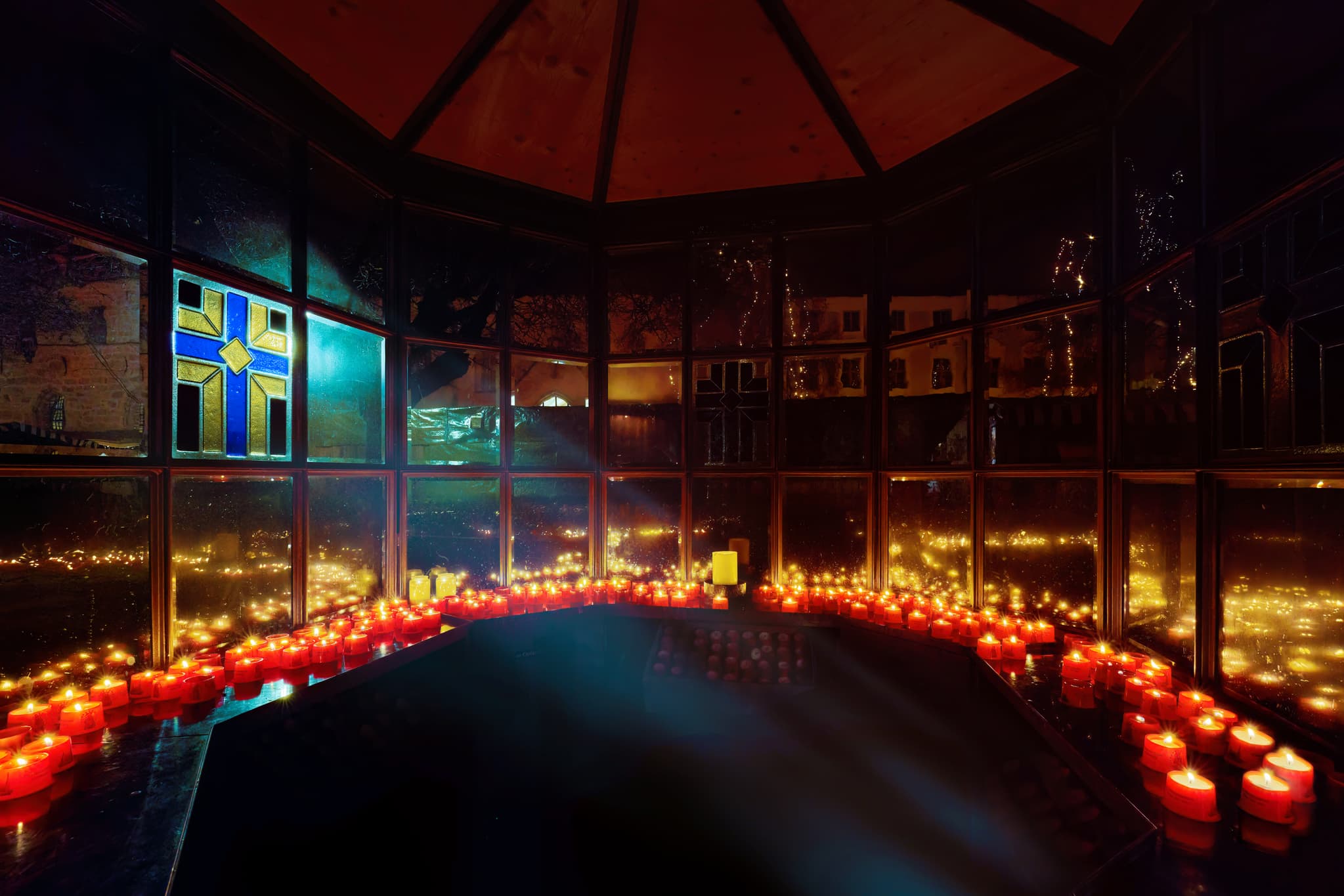 Innenansicht des Lucinariums am Kapellplatz in Altötting, Oberbayern, Deutschland. Kerzen erleuchten den Raum.