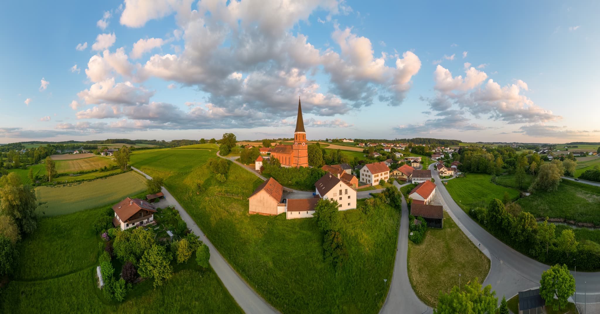 Luftbild mit Pfarrkirche St. Rupert, Hirschhorn, Rottal-Inn