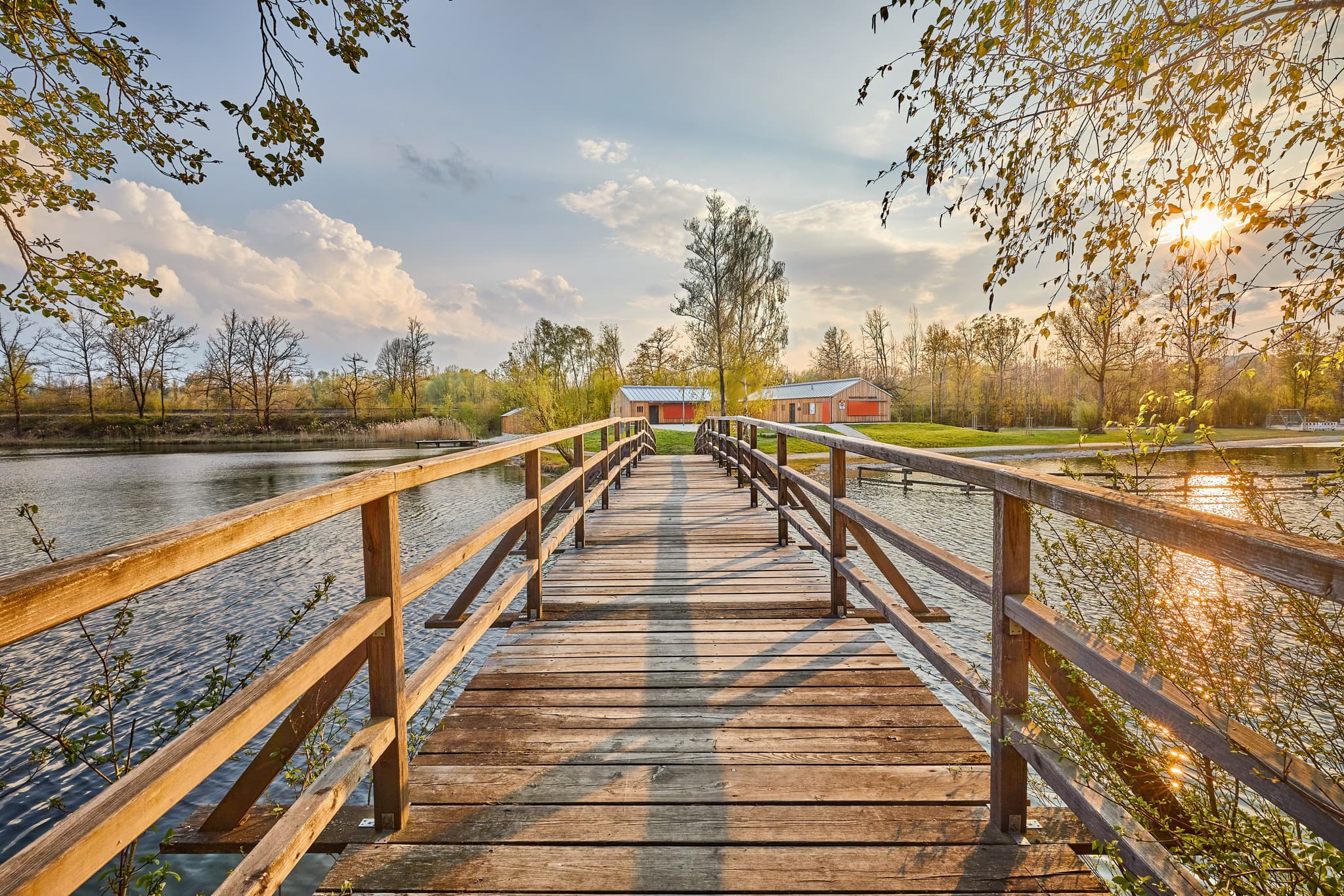 Holzsteg über den Marktler Badesee in Oberbayern, Landkreis Altötting, Region Inn-Salzach, Deutschland. Badesee und Steg bei Sonnenuntergang.