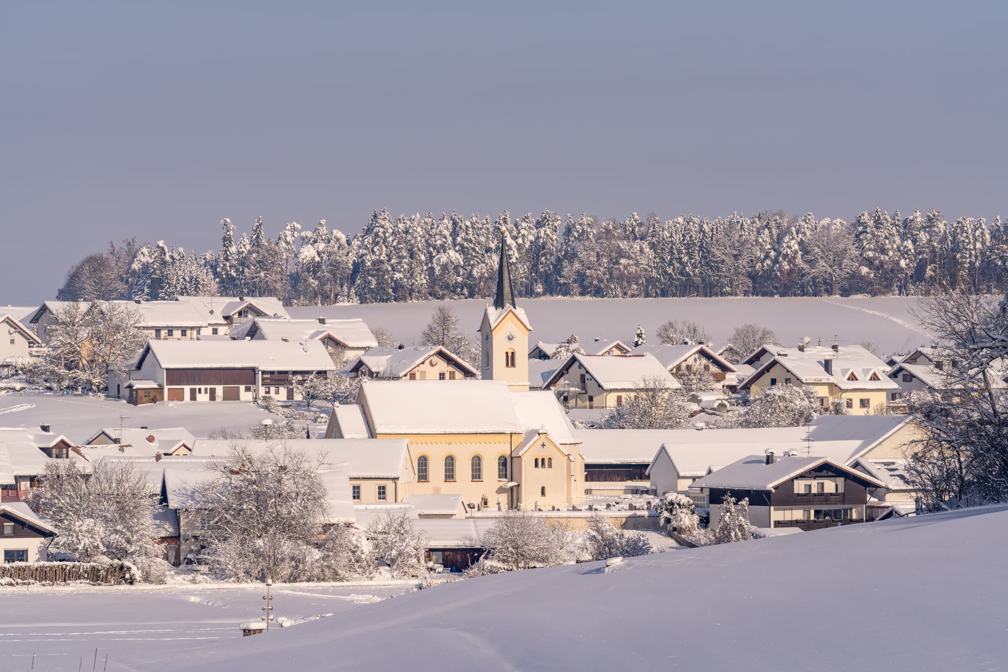 Ortsansicht von Erlbach mit Kirche im Winter, Altötting