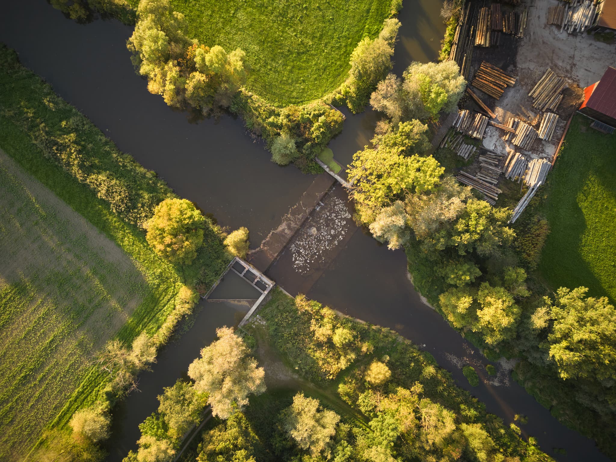 Wehr und Wasserfall an der Rott bei Löfflmühle in Hebertsfelden, Rottal-Inn, Niederbayern. Die grüne Naturlandschaft im Holzland, prägen Fluss, Ufer und Wiesen.