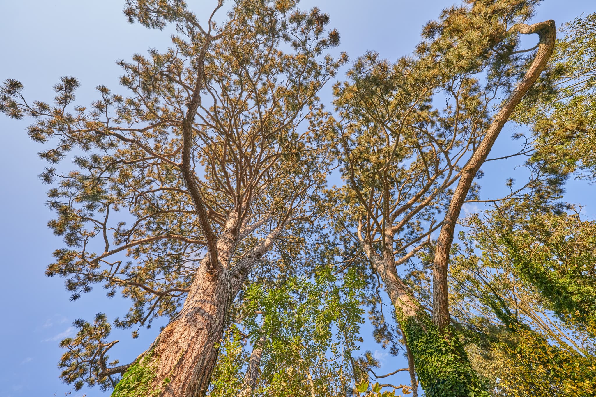 Blick in Baumkronen, mutmaßlich Schwarzkiefern, am Eisenfelden Bahnhof Winhöring, Landkreis Altötting, Oberbayern. Natur der Inn-Salzach Region, Deutschland.