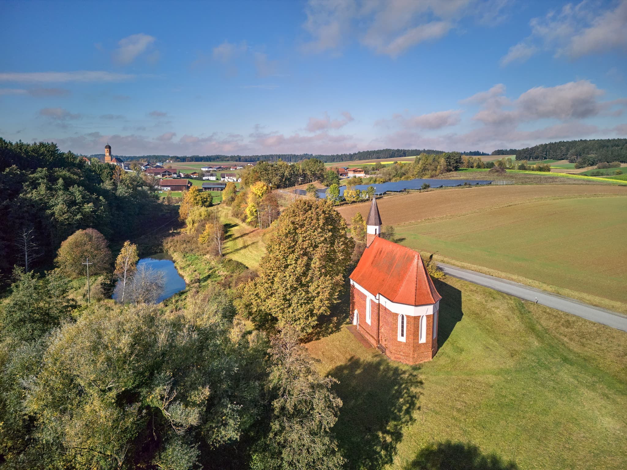Die St. Koloman Kirchlein in Martinskirchen, Wurmannsquick, Landkreis Rottal-Inn, Niederbayern. Landschaft mit Feldern und Teich im Holzland.