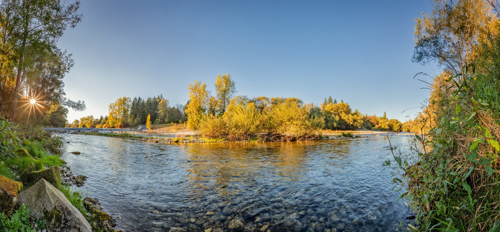 Der untere Wasserfall der Alz in Garching, Altötting, Oberbayern, Deutschland. Klare Gewässer und herbstliche Ufer prägen die malerische Inn-Salzach-Region.