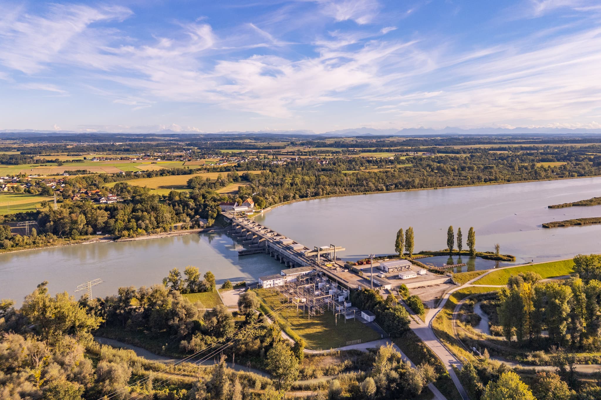 Luftbild des Inn-Kraftwerks Ering-Frauenstein am Inn, Ering am Inn, Rottal-Inn, Niederbayern, Deutschland. Die Anlage eingebettet in grüne Flusslandschaft.