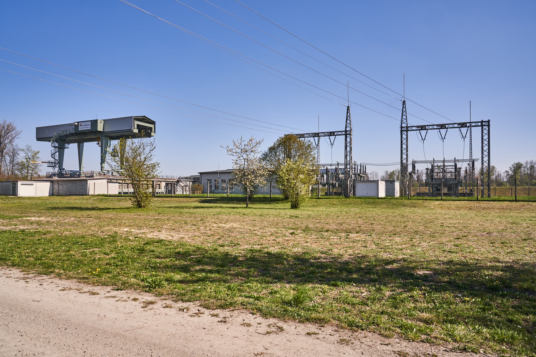 Verbund Kraftwerk am Inn in Stammham, Landkreis Altötting, Oberbayern, Deutschland. Anlage zur Energieerzeugung mit Transformatoren und Freileitungen.