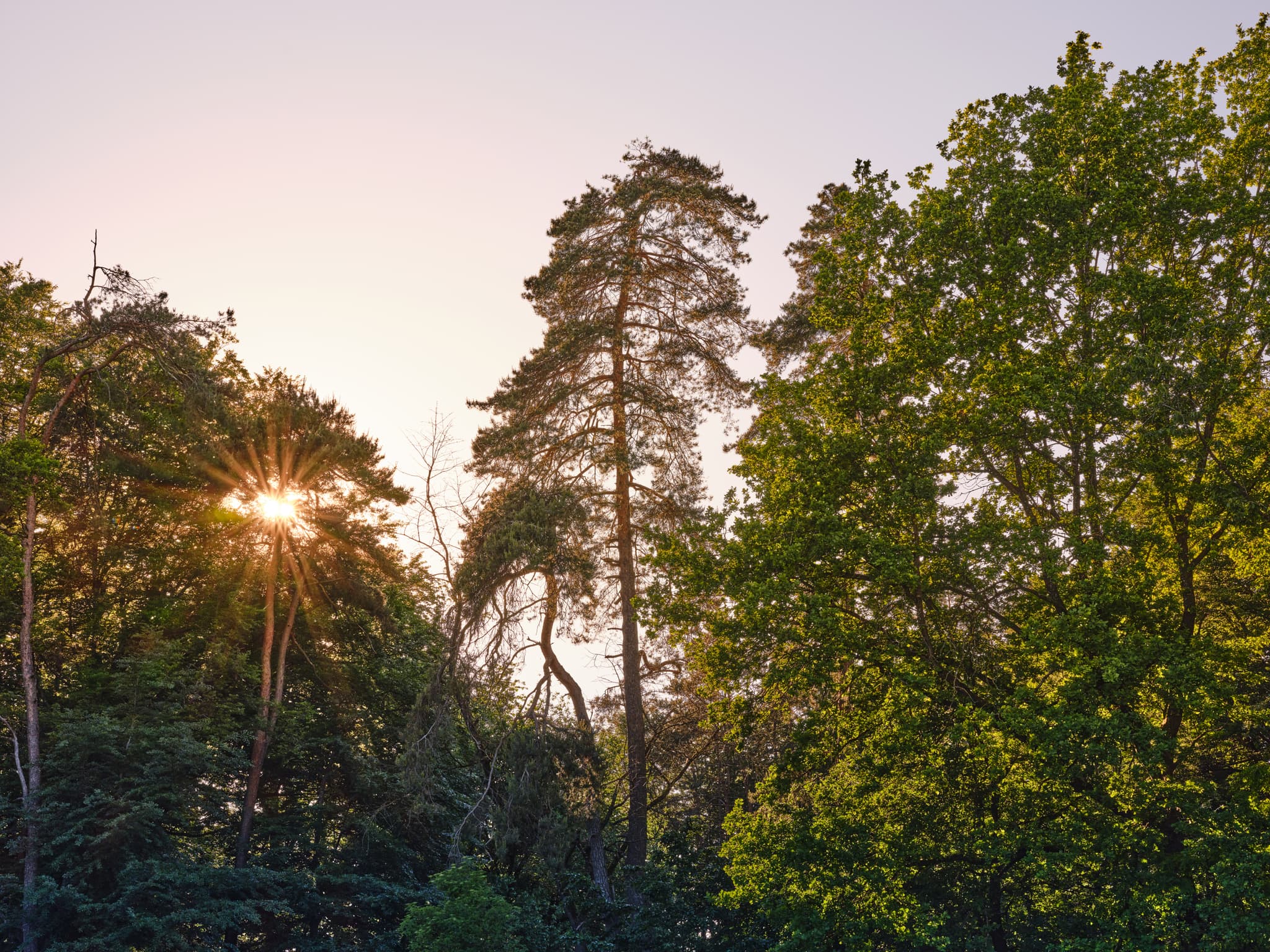 Abendstimmung am Waldrand, Schächnerhof in Erlbach, Landkreis Altötting. Sonnenstrahlen durchdringen Bäume in Oberbayern, Inn-Salzach, Deutschland.