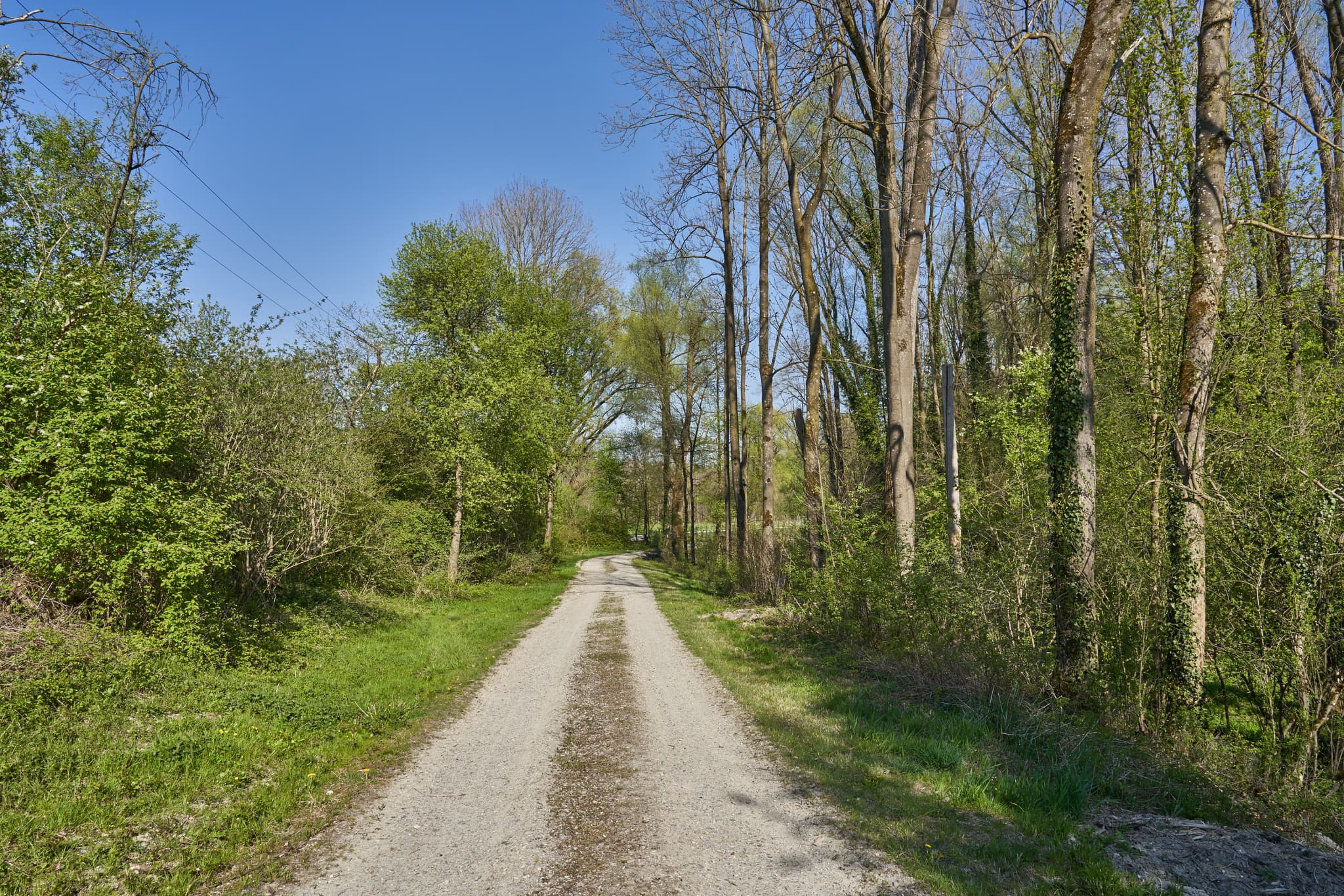 Weg zur Fischtreppe und Inn Kraftwerk in Stammham, Altötting. Landschaft Oberbayern, Inn-Salzach, Deutschland, mit Bäumen und grüner Natur.