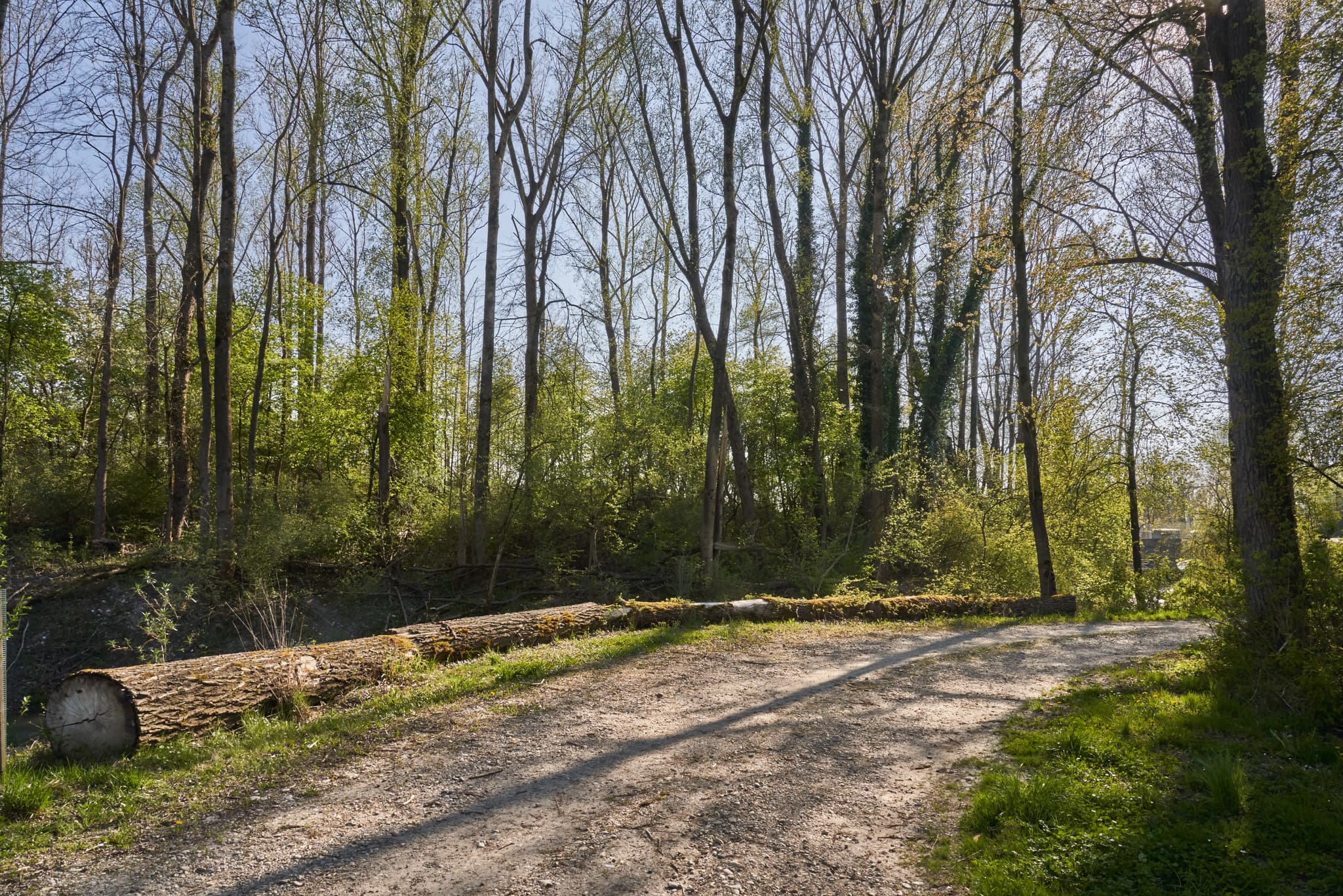 Ein Waldweg in Stammham, Altötting, Oberbayern, Inn-Salzach, Deutschland, führt durch eine frühlingshafte Waldlandschaft. Im Vordergrund liegen Baumstämme.